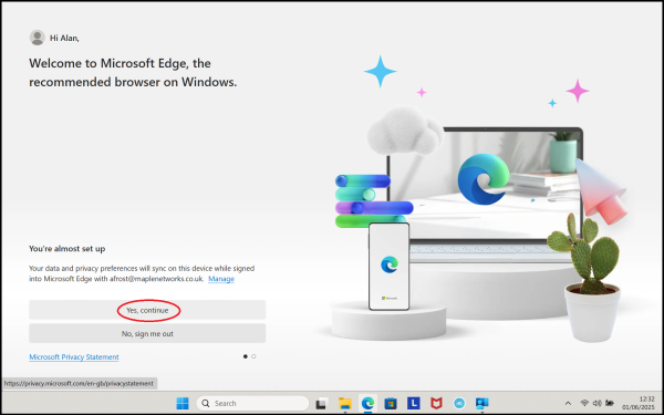 2. You will be asked if you want to sync your data with Microsoft. Click on 'Yes, continue'.