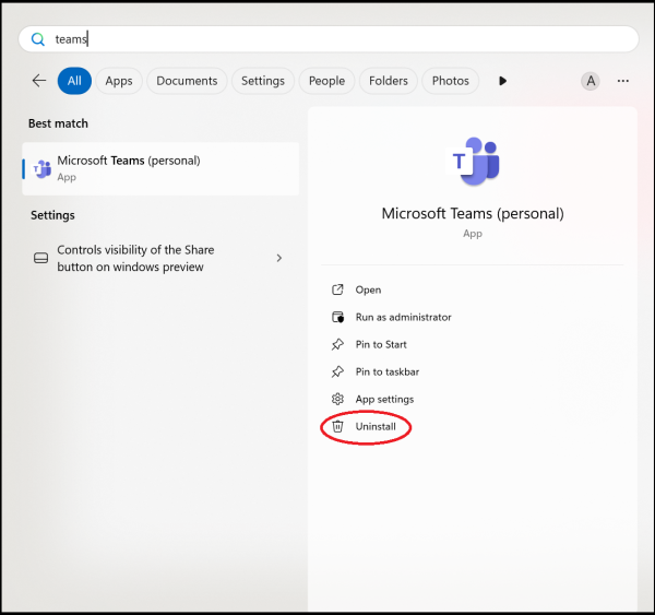 2. In the search result, you will see either 'Microsoft Teams', or 'Microsoft Teams (personal)'.