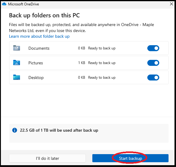 4. Click on 'Start backup'.