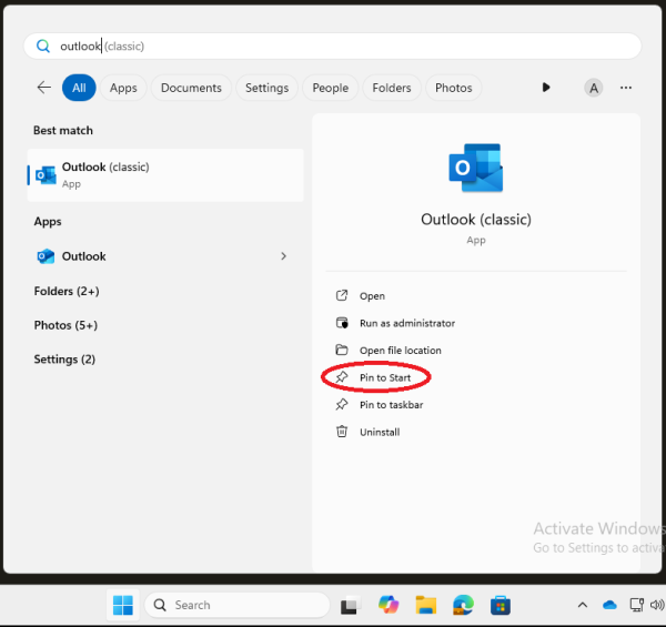1. Press the Windows key on your keyboard, then type 'Outlook c'. Click on 'Pin to Start' under 'Outlook (classic)'.