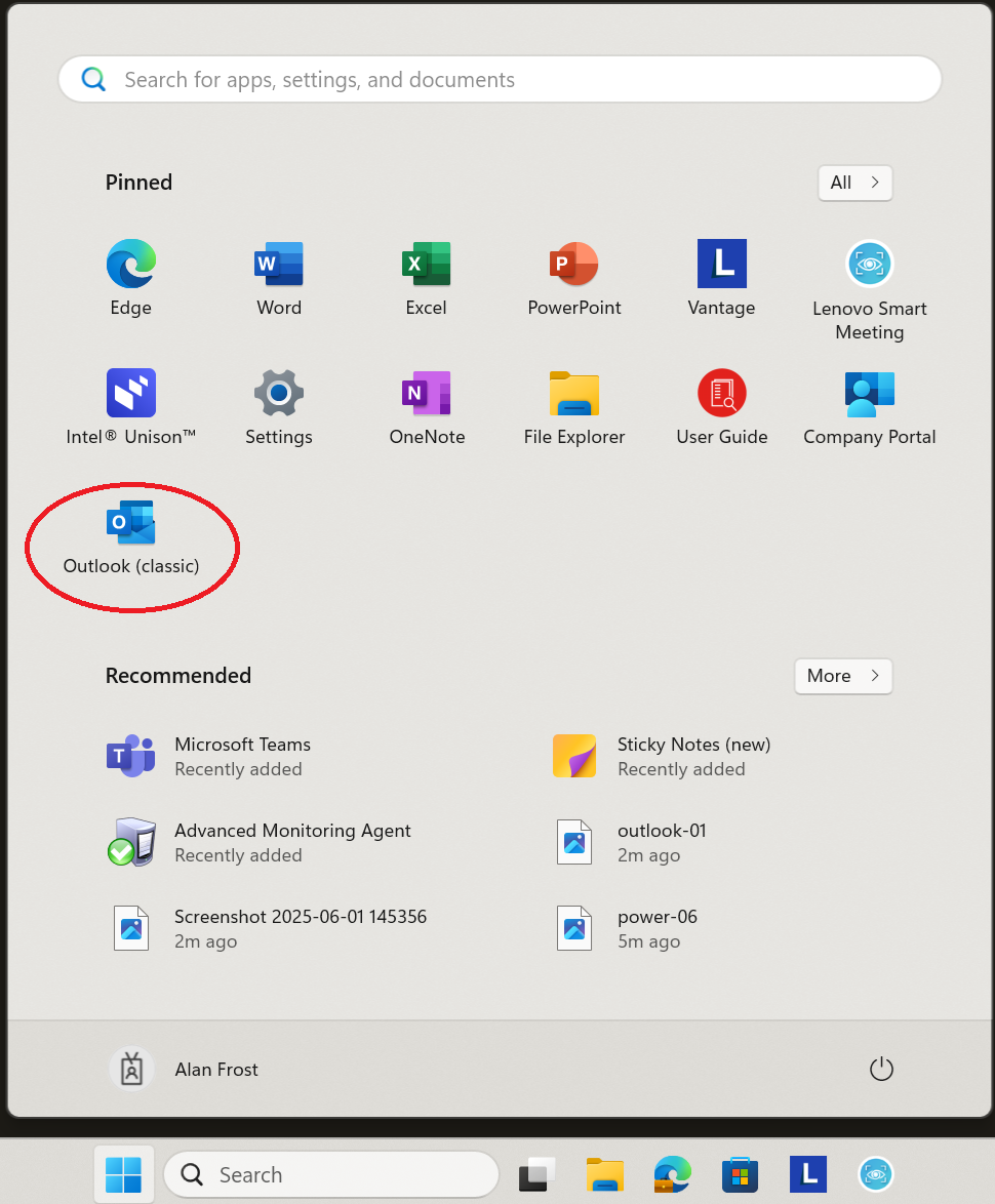 2. Press the Windows key on your keyboard, then click on 'Outlook (classic)'.