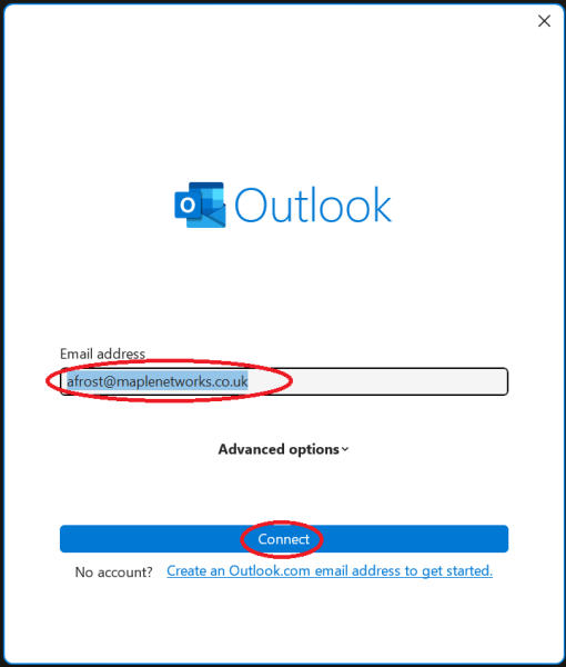 3. When Outlook loads it will try to find your account. If it works, your email address will be in the next box. If it is not there, type in your email address. Then, click on 'Connect'.
