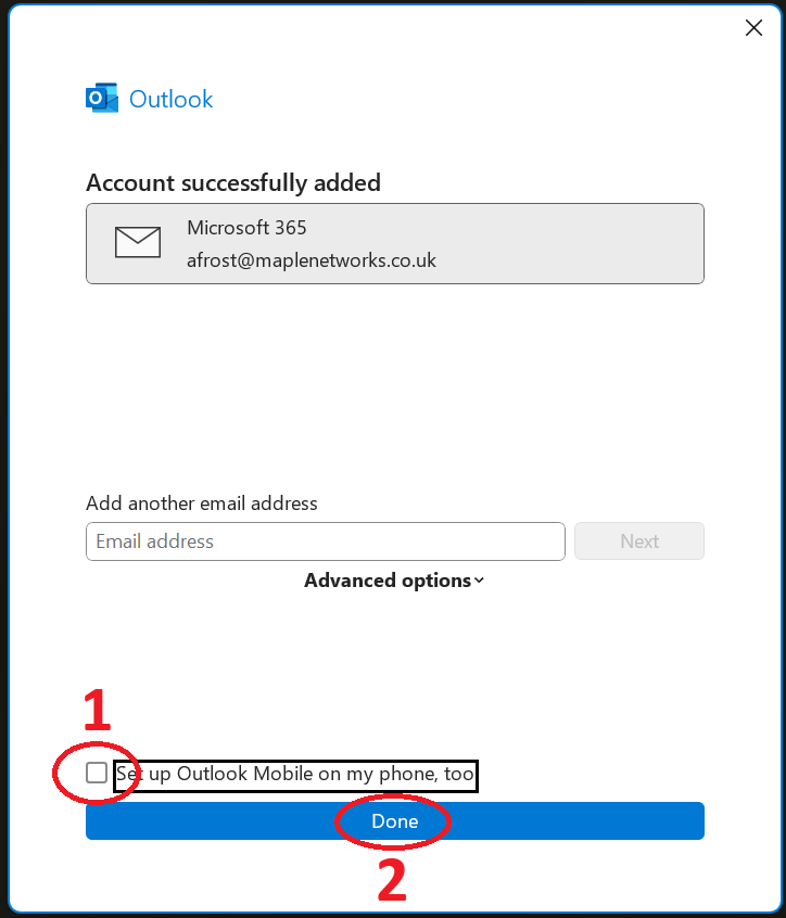 4. Unlick the box 'Set up Outlook Mobile...', then click on 'Done'.