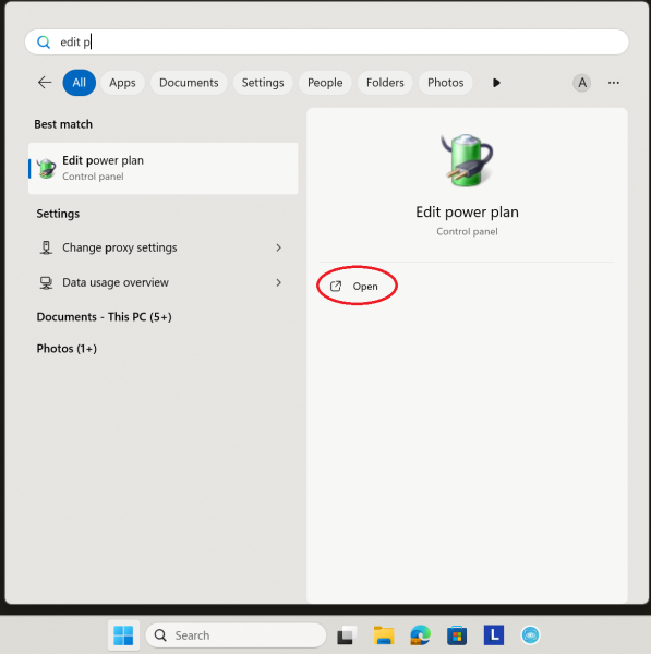 1. Press the Windows key on your keyboard, then type 'edit po', next click on 'Open' under 'Edit Power plan'.