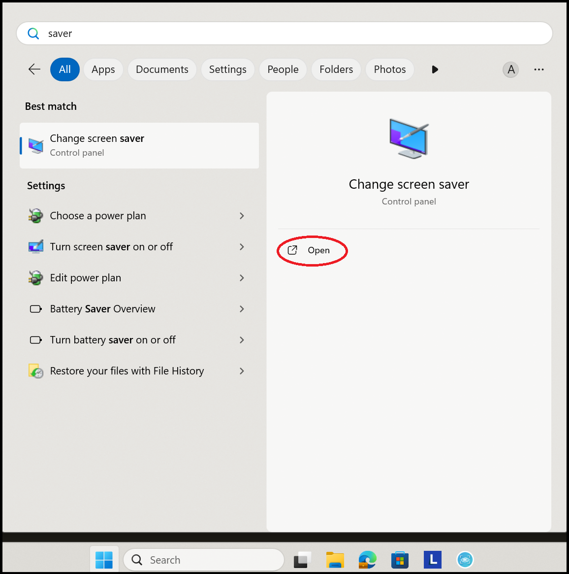 5. Press the Windows key on the keyboard, then type 'saver'.  Click on 'Open' under 'Change screen saver'.