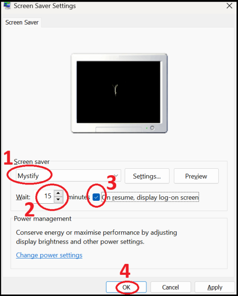 6. Change the Screen saver to 'Mystify', the wait time to 15 minutes, and tick the box for 'On resume display the log-on screen. Click on 'OK'.